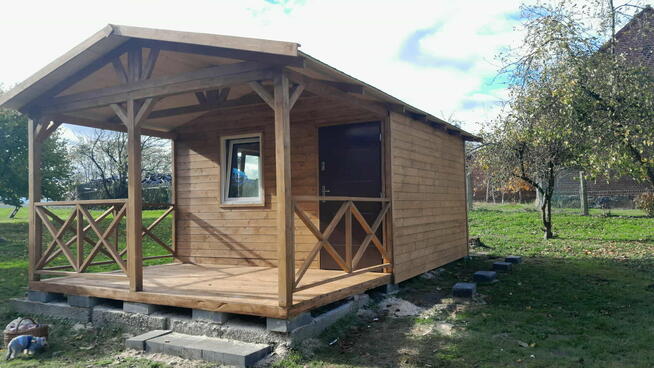 Domek 3x3 plus taras 3x2 składa się z ściany i dach deska pióro wpust podłoga deska 2.5 cm dach kryty gontem okno ...