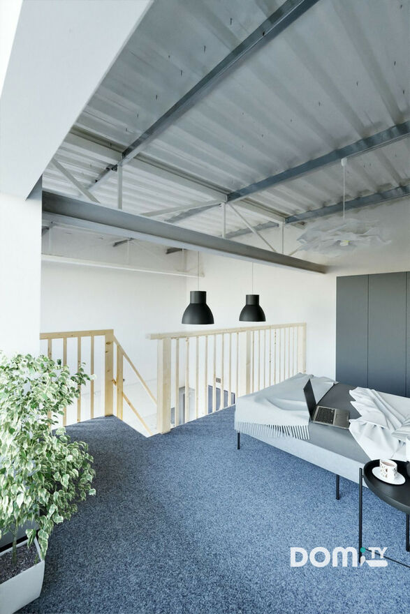 Wysokość pomieszczenia to prawie 5 metrów a piękne przeszklenia dodają wnętrzu nietuzinkowości i przestronności. Funkcjonalna antresola umożliwia rozgraniczenie strefy dziennej od wieczornej. Dużo przestrzeni na aranżacje biura w trybie home office.